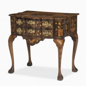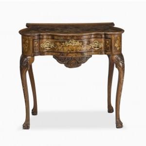 Un tiroir en arbalète, marqueterie de fleurs, pieds griffes, pla...