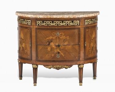 Marqueterie de bois fruitiers, marbre orangé, 92x111x45 cm