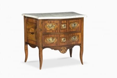 Façade galbée ouvrant par trois tiroirs, marqueterie de bois fru...