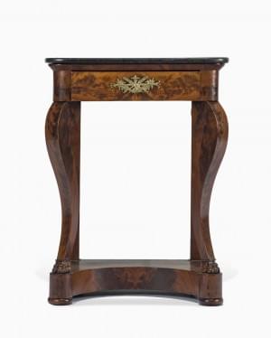 Un tiroir, montants pilastres à l'égyptienne, pieds griffes,