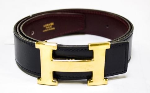 Ceinture boucle H doré, cuir noir et revers bordeaux, L 92 cm