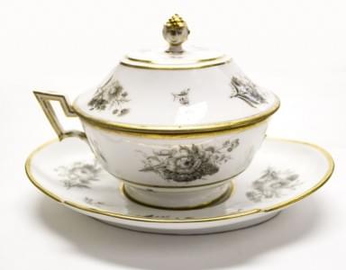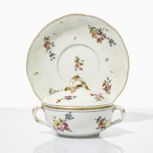 3134. Bouillon sur présentoir à filet doré et décor de bouquets de fle...