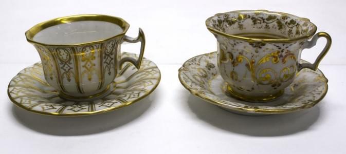 3144. Deux tasses à décor blanc et or de rinceaux et ogives