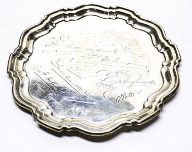 3254. Plat rond à bordure mouvementée gravé de signatures