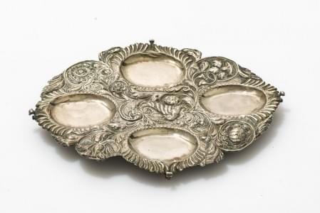 Métal argenté orné de coquilles, agrafes et phénix, D 30 cm