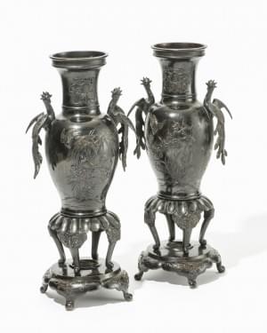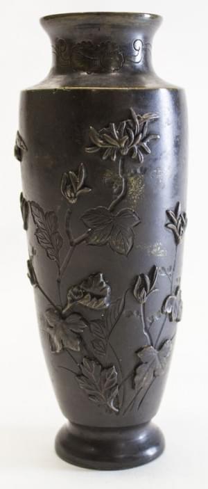 Bronze à décor appliqué et gravé de feuilles et oiseaux, Japon,...