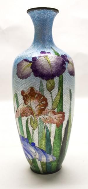Email cloisonné, décor d'iris polychromes sur un fond bleu ciel...