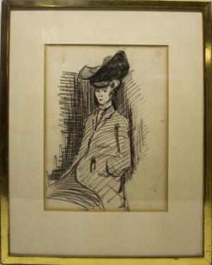 Jeune élégante à la cape et au chapeau, fusain, signé Moreau, 33...
