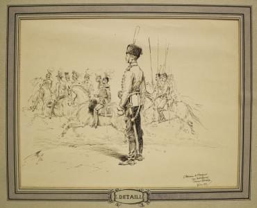 Militaires en uniforme, plume, signée avec envoi et datée 1881,...