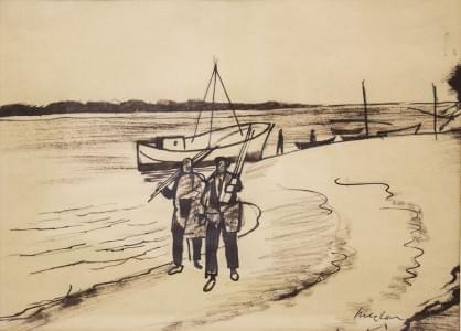 Soldats sur la plage, encre et aquarelle sur papier signée, 23x3...