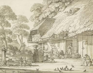 Cour de ferme animée, lavis d'encre sur papier, 18x23 cm