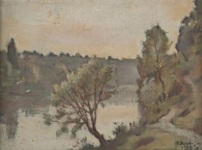 Paysage lacustre, huile sur carton signée, 24x31,5 cm
