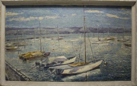 Bateaux au port sur le lac, huile sur pavatex signée et datée 55...