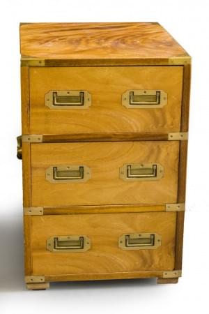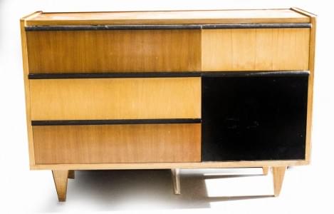 Placage de bois blond et bois noirci, quatre tiroirs et un abatt...