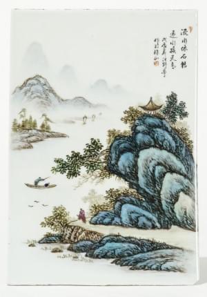 Porcelaine à décor de personnages, oiseaux et calligraphies, sig...
