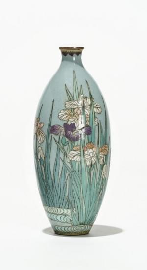 Cuivre et émaux à décor d'Iris sur fond bleu ciel, H 12,5 cm