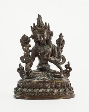 Figurée assise en padmasana, bronze à patine brune, H 16 cm