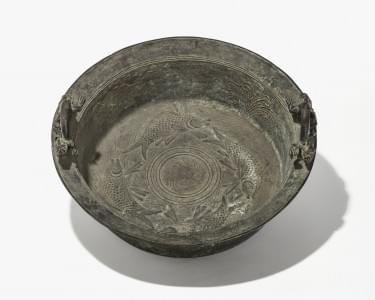 Bronze patiné à décor en léger relief de poissons, H 17 cm, D 40...