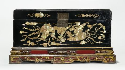 Bois laqué noir à décor incrusté de nacre, base en bois doré, 24...