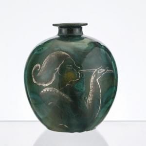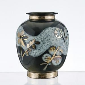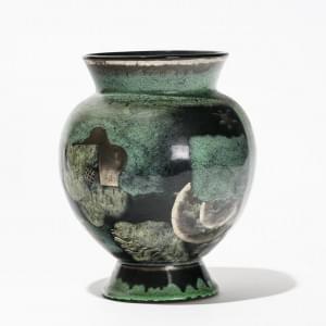 Vase sur pied, céramique émaillée noir, vert et argent, non sign...