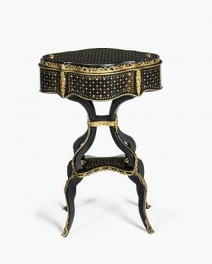 Pied tripode, décor de damier, chinoiseries et fleurs, marqueté...