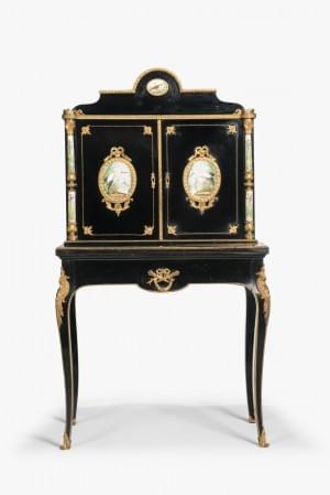 A décor de fleurettes marquetées en nacre, bois noirci, bronze,...