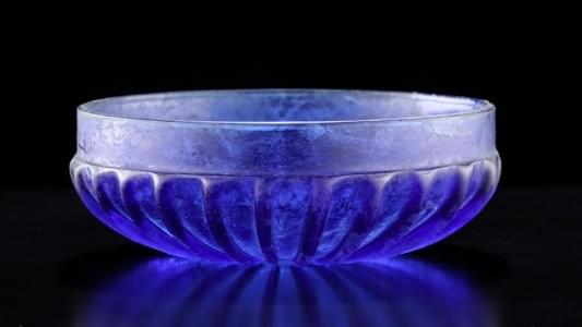 Verre bleu foncé, panse ornée de 26 longues cannelures, bordure...