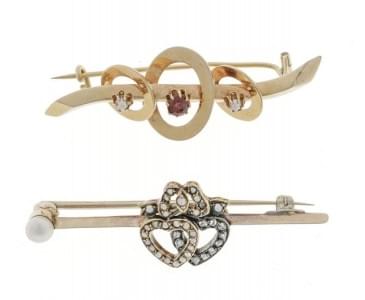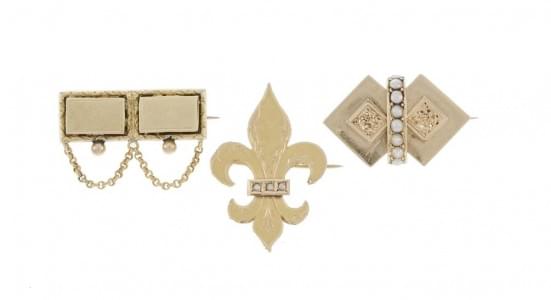 3097. Lot de trois broches, l'une à motif de fleur de lys sertie de tr...