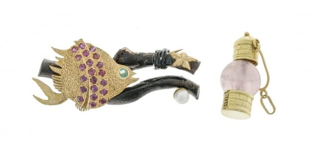 3059. Lot comprenant une broche à motif de poisson serti de rubis et d...