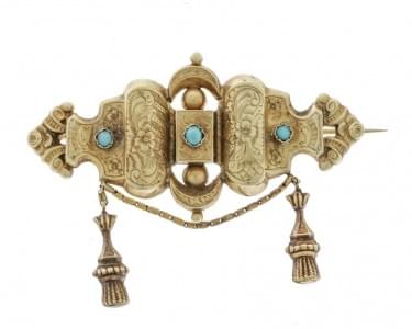 3077. Broche ciselée sertie de trois turquoises en cabochon gravée au...