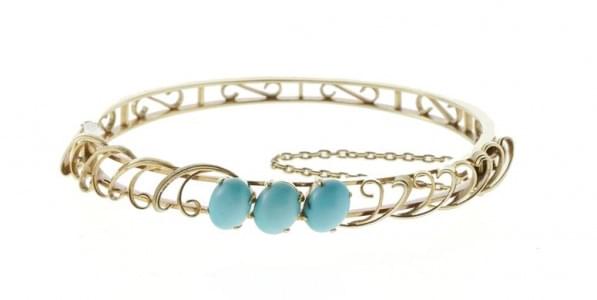 3095. Bracelet jonc rond ouvrant et ajouré serti de trois turquoises o...