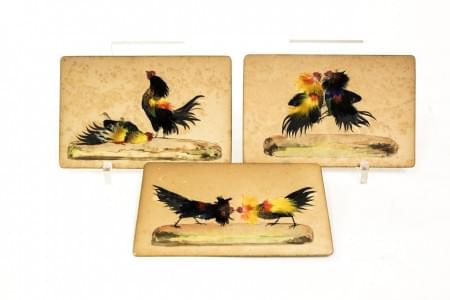 3479. Trois compositions en plume figurant des combats de coq,