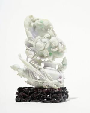 Jade sculpté de crabes, écrevisses, lotus et panier, H 18 cm