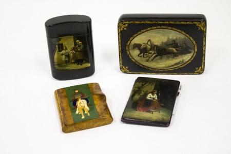 3674. Cinq boîtes à décor de scènes historiques et populaires russes