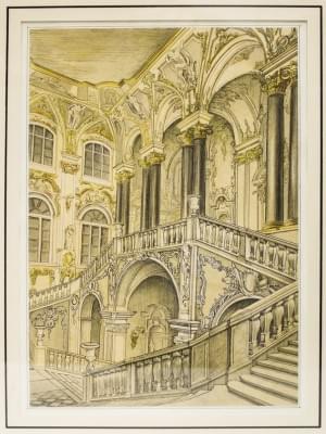 Grand escalier d'un palais à Saint Petersbourg, encre et lavis d...