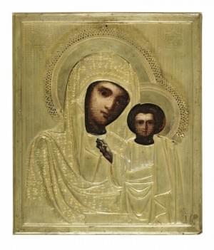 Icône russe, tempera sur panneau, oklade en métal doré, XIXe s,...