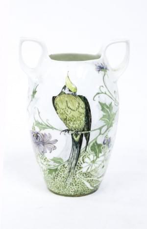 3819. Deux vases à décor de fleurs et un baguier à décor de chouette