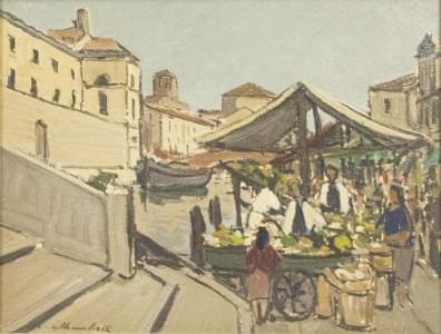 Marché au bord du canal (Chioggia), huile sur pavatex, signée et...