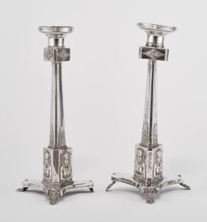 488. Paire de chandeliers à motif de godrons et bagués de palmettes,...