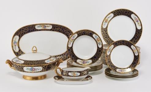 529. Service à dîner à décor léopardé or sur fond bleu nuit et bouque...