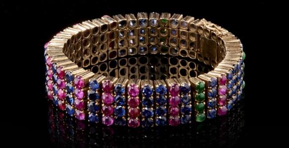 690. Bracelet manchette souple serti de lignes de saphirs, rubis et d...