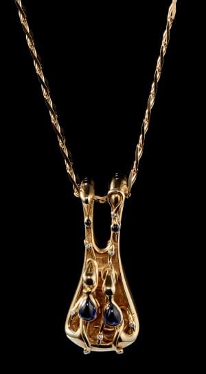 693. Chaîne retenant un pendentif stylisé serti de saphirs cabochon e...