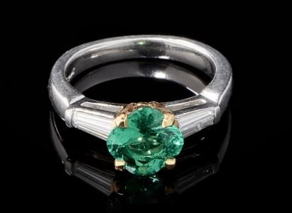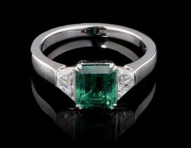 702. Bague sertie d'une émeraude taille coussin (env. 1,4 ct) épaulée...