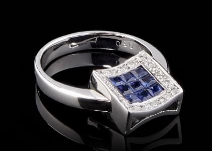 713. Bague à motif carré réversible serti d'un côté de saphirs en ser...