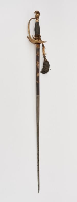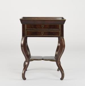 Trois tiroirs, acajou et bois fruitier marqueté en filets, métal...