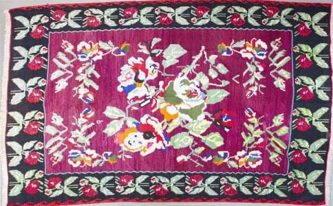 A motif de fleurs et animaux, bordure à fleurs sur fond mauve cl...