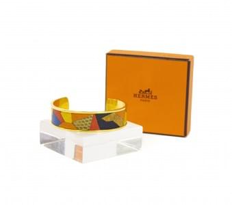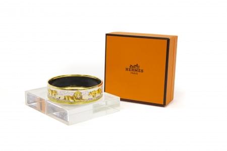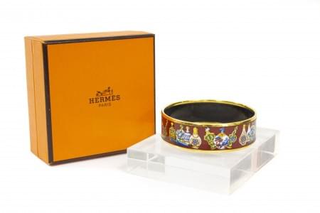 3115. Hermès, bracelet jonc émaillé à décor de flacons à priser sur fo...