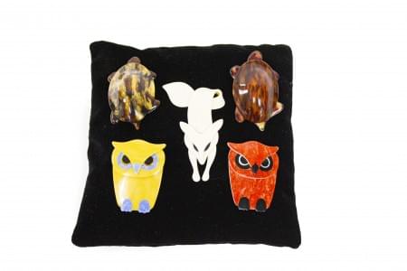 3126. Lea Stein, lot de cinq broches à motif de deux hiboux, deux tort...