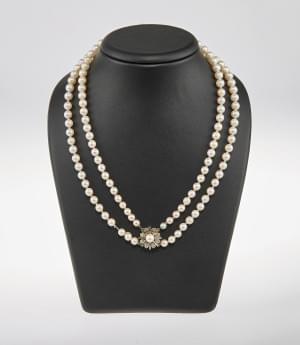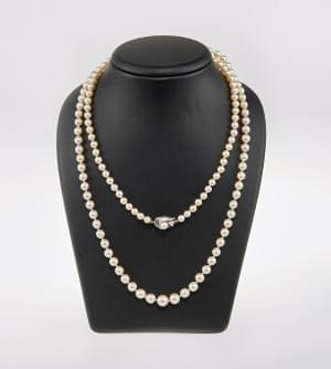 3105. Collier de perles en chute terminé par un fermoir serti d'une pe...