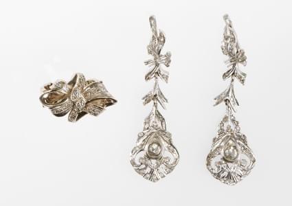 3153. Lot de boucles d'oreilles et d'une bague sertis de roses de diam...